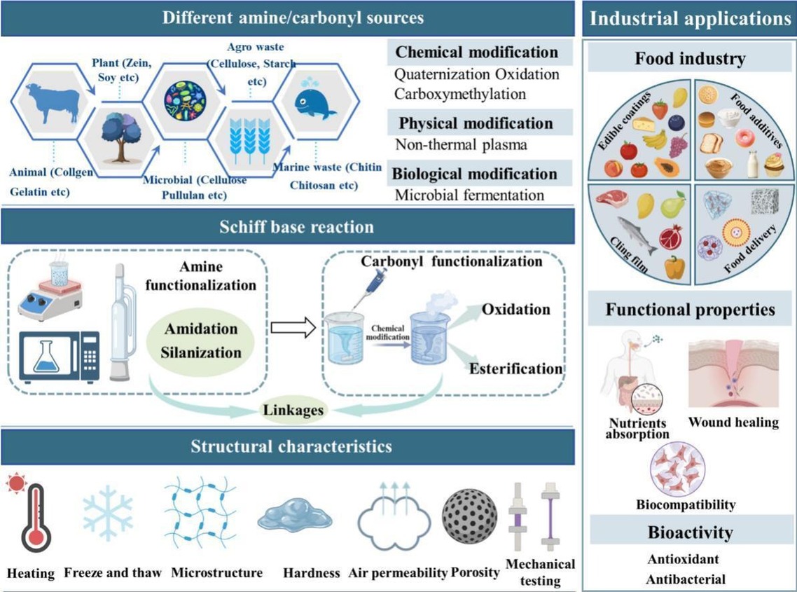 本文综述了希夫碱的形成机理,包括其化学结构、组成及组分功能特性,重点探讨了食品级天然反应物(如蛋白质、多糖、植物活性物质)与合成组分之间的协同作用,及其对材料性能的作用机制。此外,论述了希夫碱在食品胶体、功能材料及递送体系中的创新应用。 本研究旨在为希夫碱在食品体系中的应用提供有价值的理论支撑,同时为食品保鲜、营养递送及品质提升提供新思路。