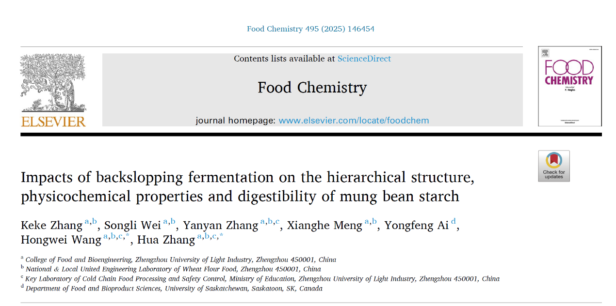 中心张华课题组博士生张可可在《Food Chemistry》(中科院一区,IF = 9.8)发表了题为“Impacts of backslopping fermentation on the hierarchical structure, physicochemical properties and digestibility of mung bean starch”的研究论文。第一作者为2023级博士研究生张可可。