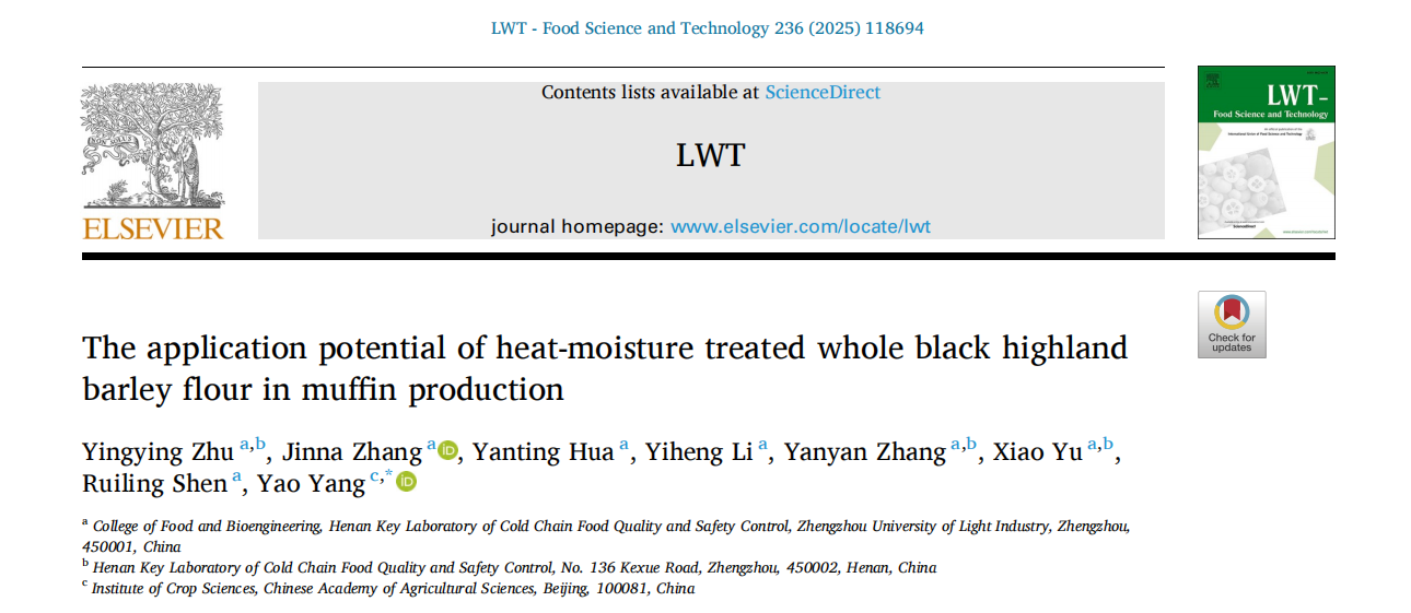 中心朱莹莹副教授在《LWT - Food Science and Technology》(中科院一区,IF=6.6)发表了题为“The application potential of heat-moisture treated whole black highland barley flour in muffin production”的研究成果。