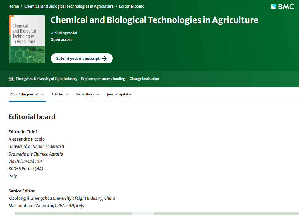 近日,根据Chemical and Biological Technologies in Agriculture期刊发展要求,聘任中心冀晓龙副教授新任Chemical and Biological Technologies in Agriculture高级编辑(临时主编)。
